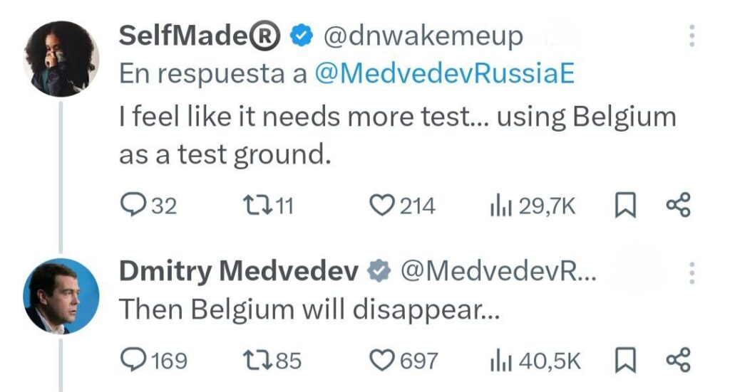 “Чувствую, ему [“Посейдону”] не помешало бы еще одно испытание… Испытательным полигоном могла бы стать Бельгия”, написал в соцсети Медведеву пользователь @dnwakeup. На что Дмитрий Медведев ответил: “Тогда Бельгия исчезнет”.