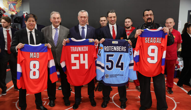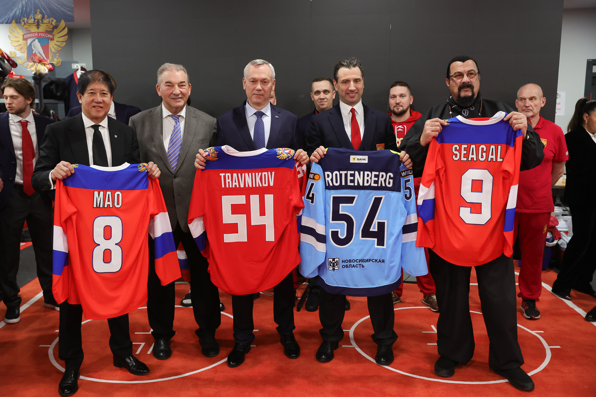 Организаторы матча между сборными России и Белоруссии вручили подарки Стивену Сигалу и его спутникам – хоккейные свитера российской команды. Сигал стал девятым номером, Стивен Мао – восьмым, Андрей Травников и Роман Ротенберг получили свитера с 54-ым номером как обозначение Новосибирска.